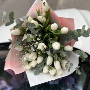 Букет с гипсофила и мече в луксозна чантичка “Kisses” 💋💋