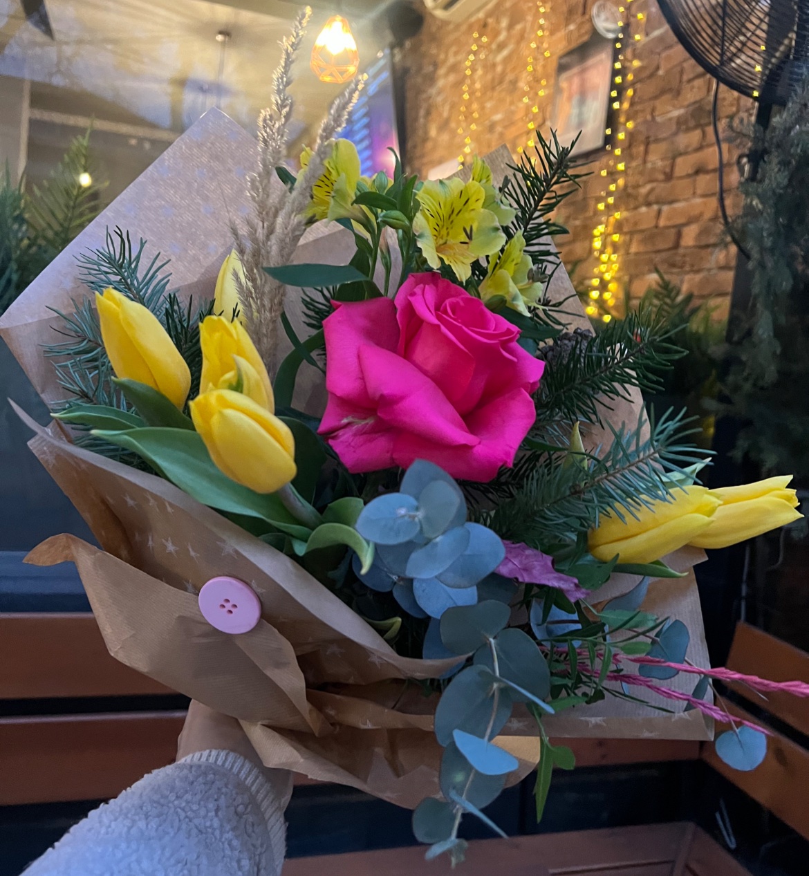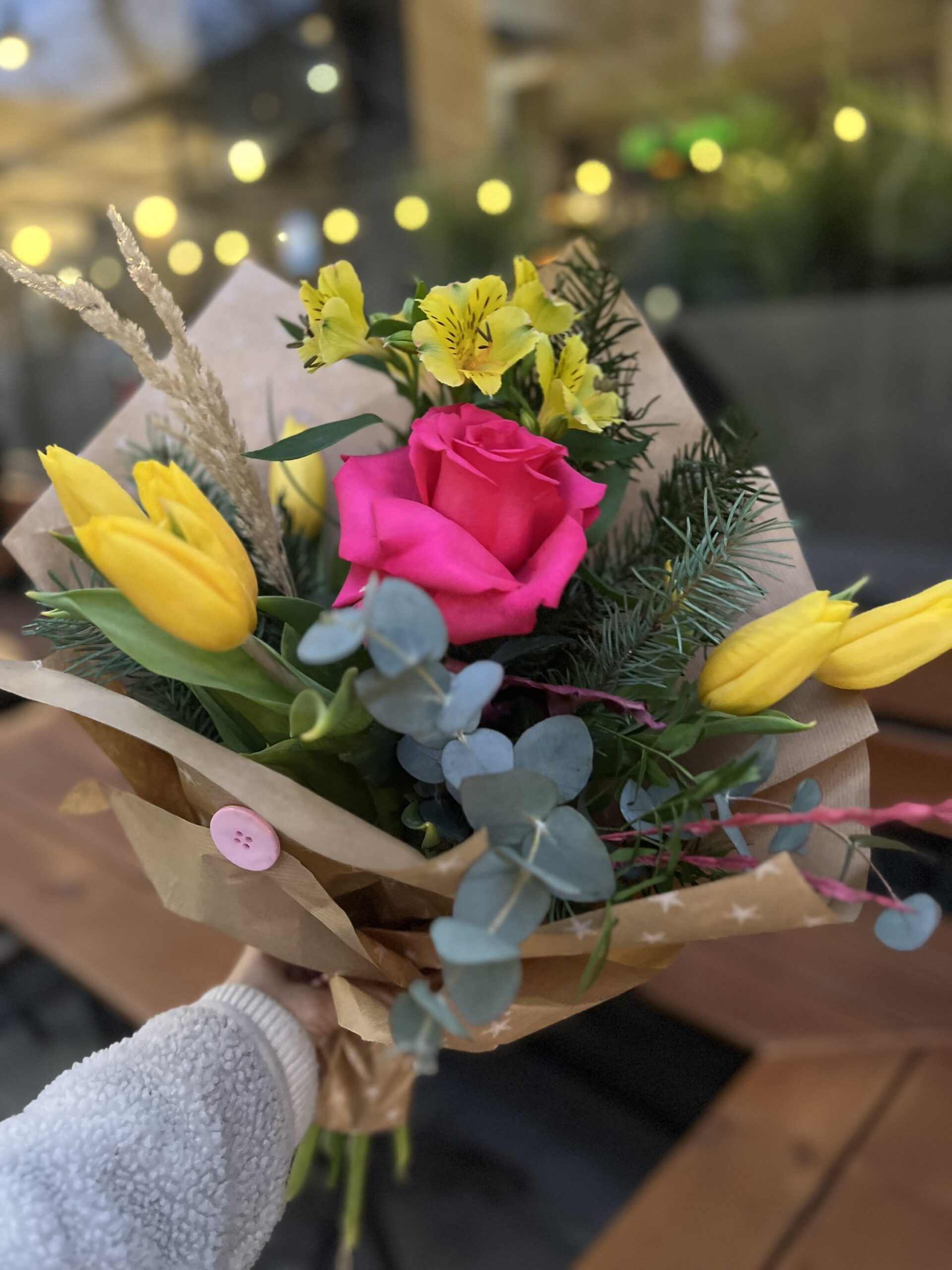Winter Kiss е букет от микс пролетни цветя с роза, алстромерия и зимни нотки, или който носи слънце в студените дни — жълти лалета като обещание за светлина, наситено розова роза като сърце на композицията и ефирни зелени акценти, които добавят дълбочина и свежест.