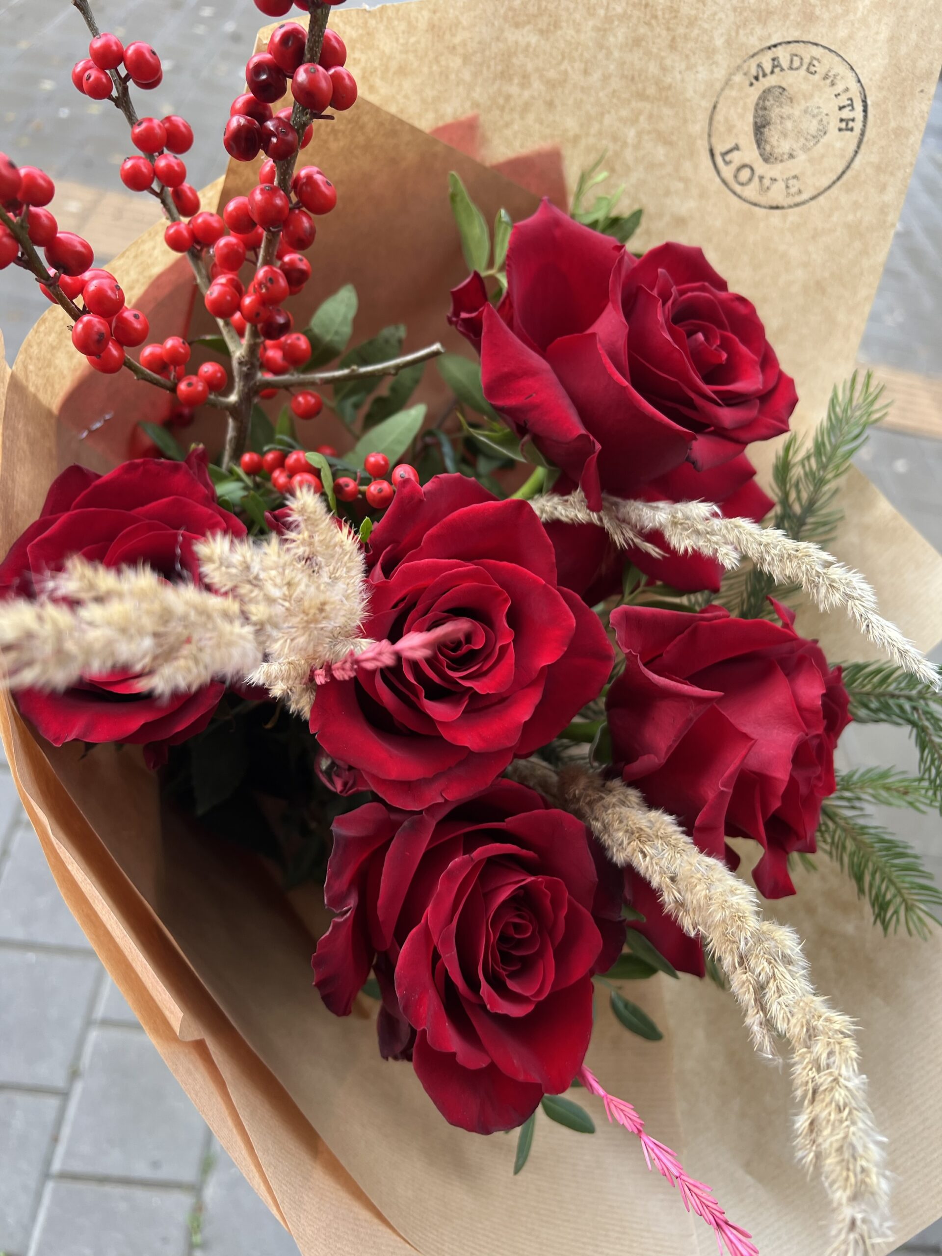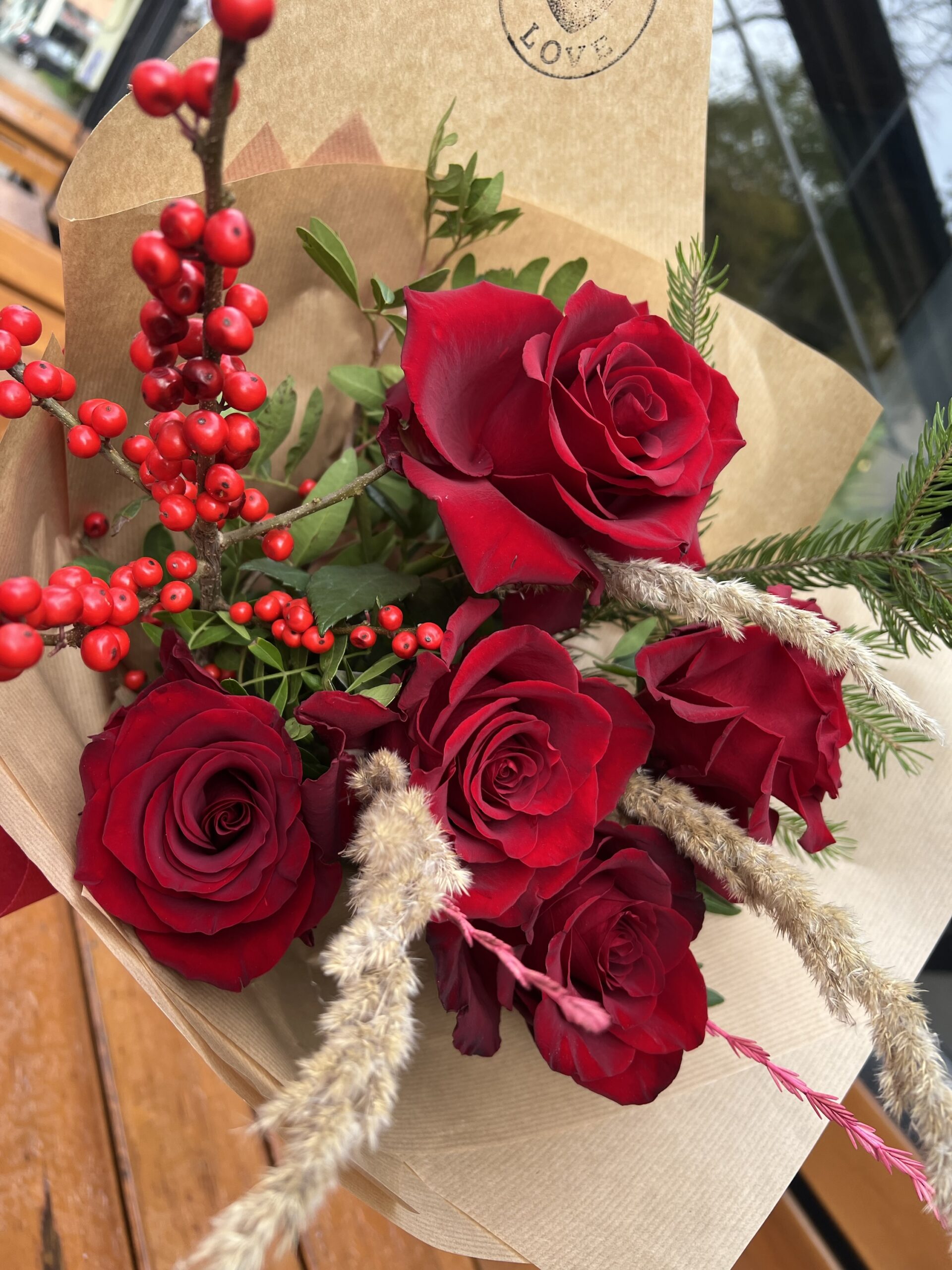 „Winter Romance“ съчетава нежността на кадифените червени рози с коледното сияние на илекс и фините златисти треви.