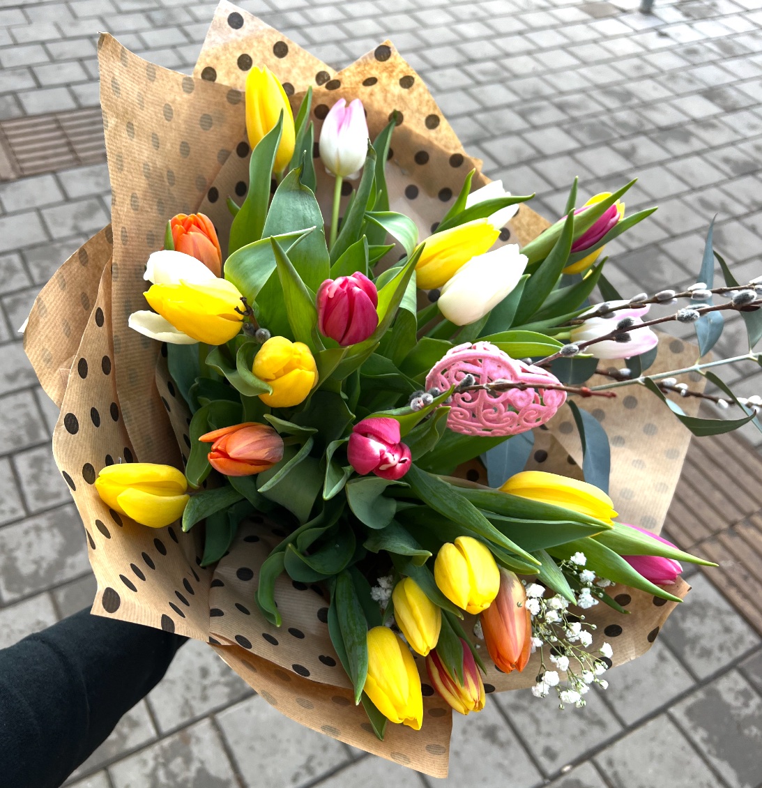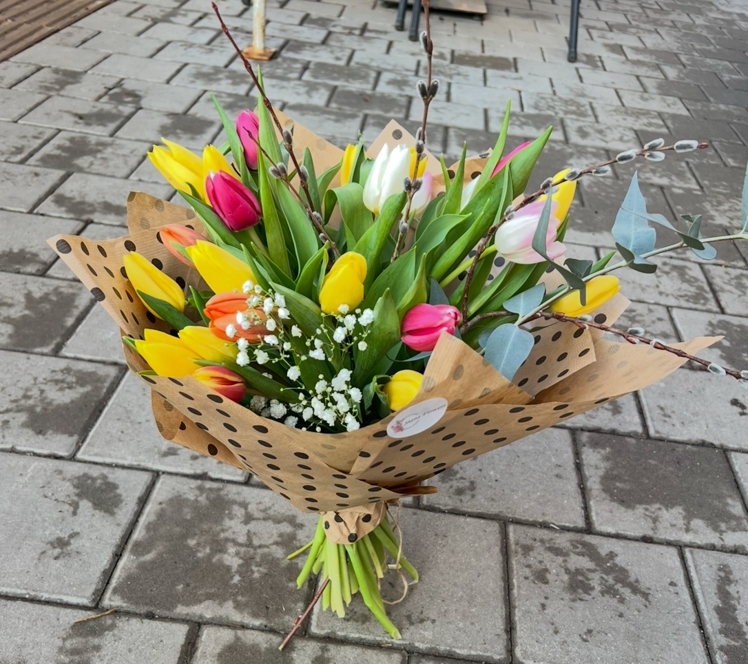 Пролетен букет от пъстри лалета, създаден да носи настроение, светлина и истинска емоция. „Цветна утрин“ съчетава свежи лалета в жълто, бяло, розово и топли пролетни нюанси, аранжирани с естествена зеленина и стилна крафт опаковка. Всеки букет е изработен ръчно с внимание към детайла и характерния почерк на Siana Flowers.