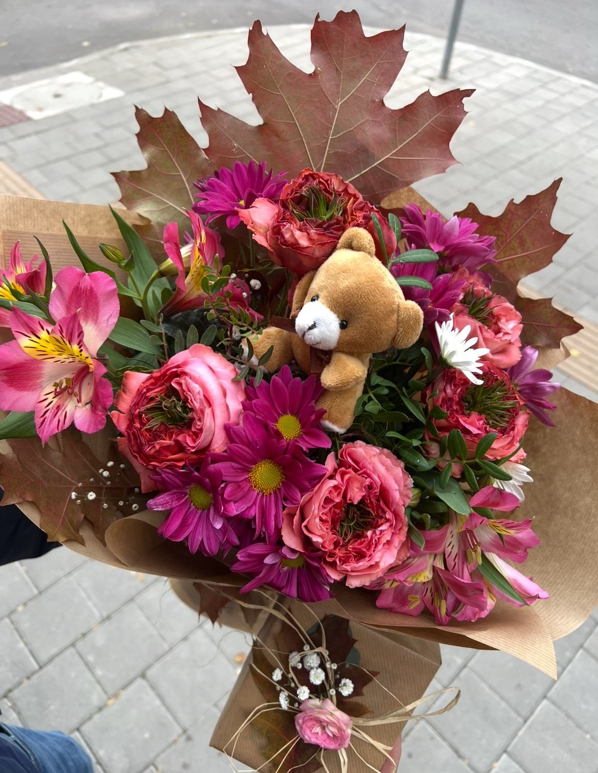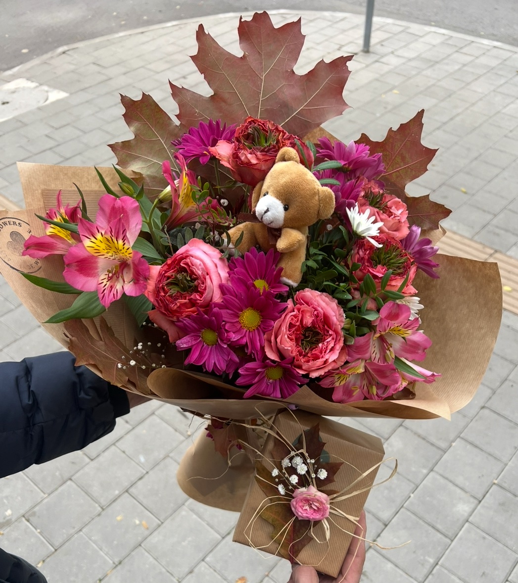 Съчетание от розови рози, алстромерии, хризантеми и обгръщащи листа, в чийто център се крие малко мече – символ на грижа, уют и обич.