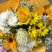 Жълтата роза е символ на приятелство и топлота, бялата роза – на чистота и ново начало, а златните хризантеми и гербери добавят щастие и жизненост.