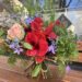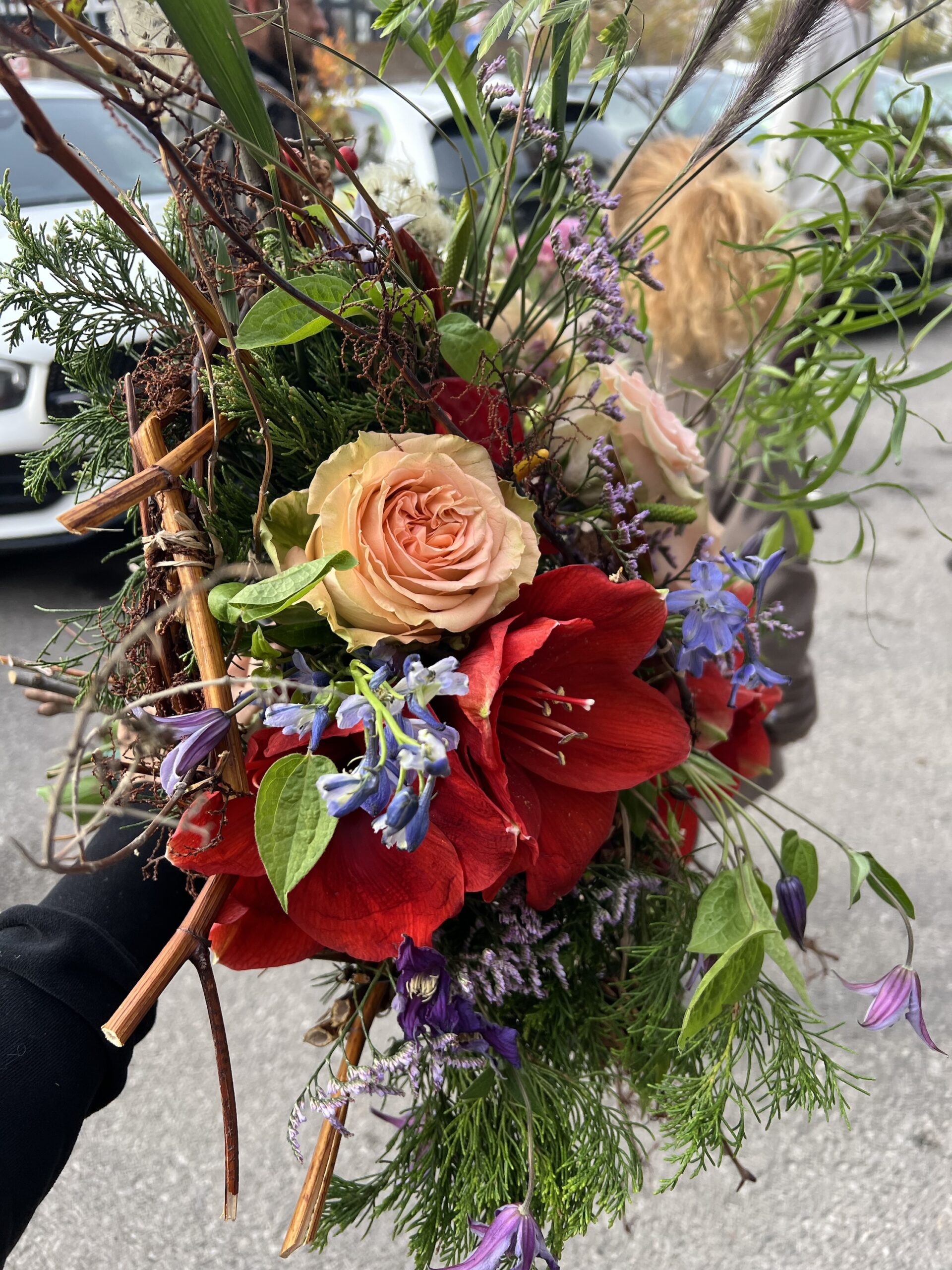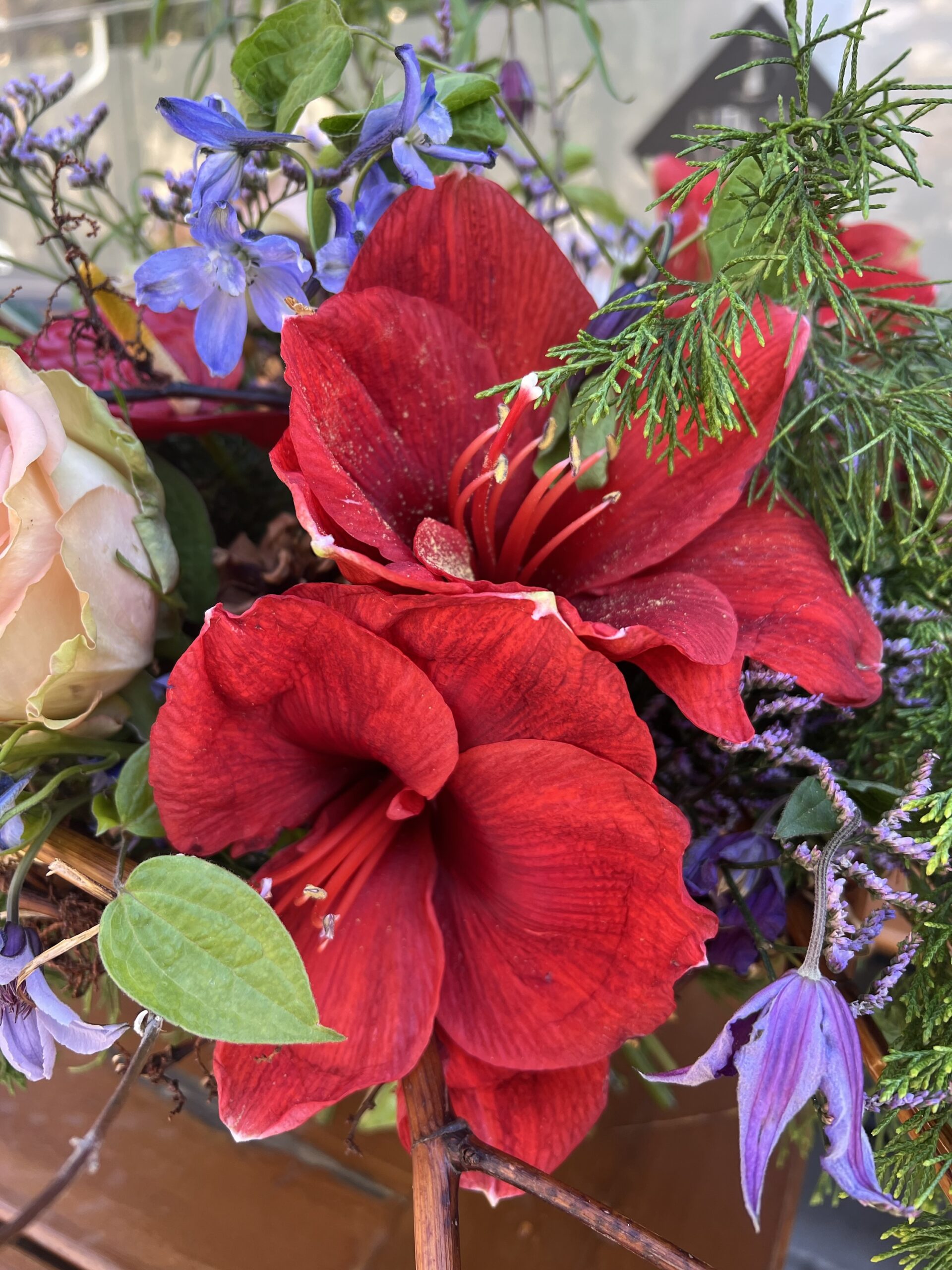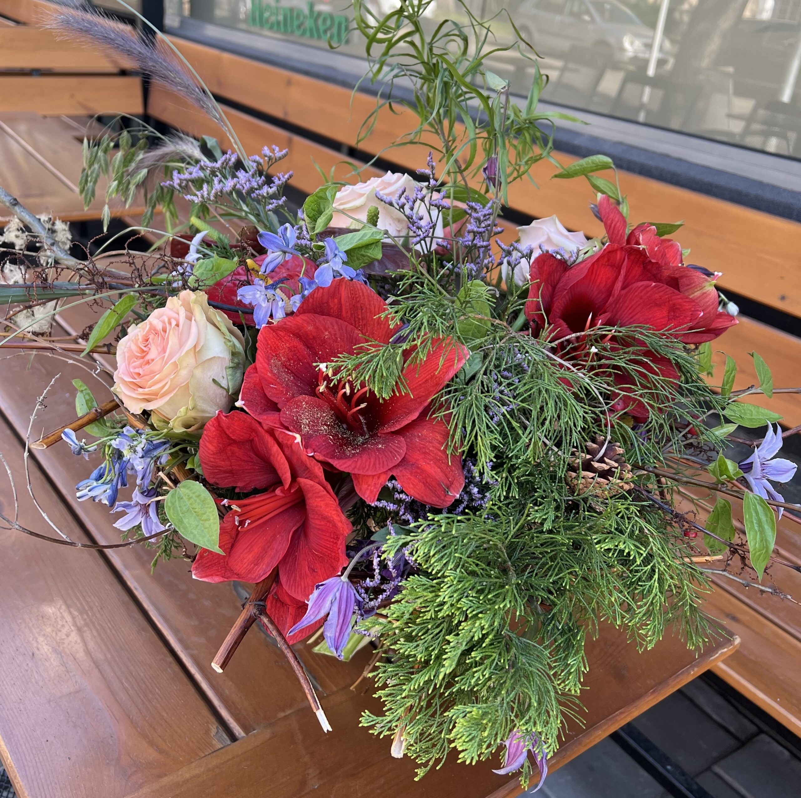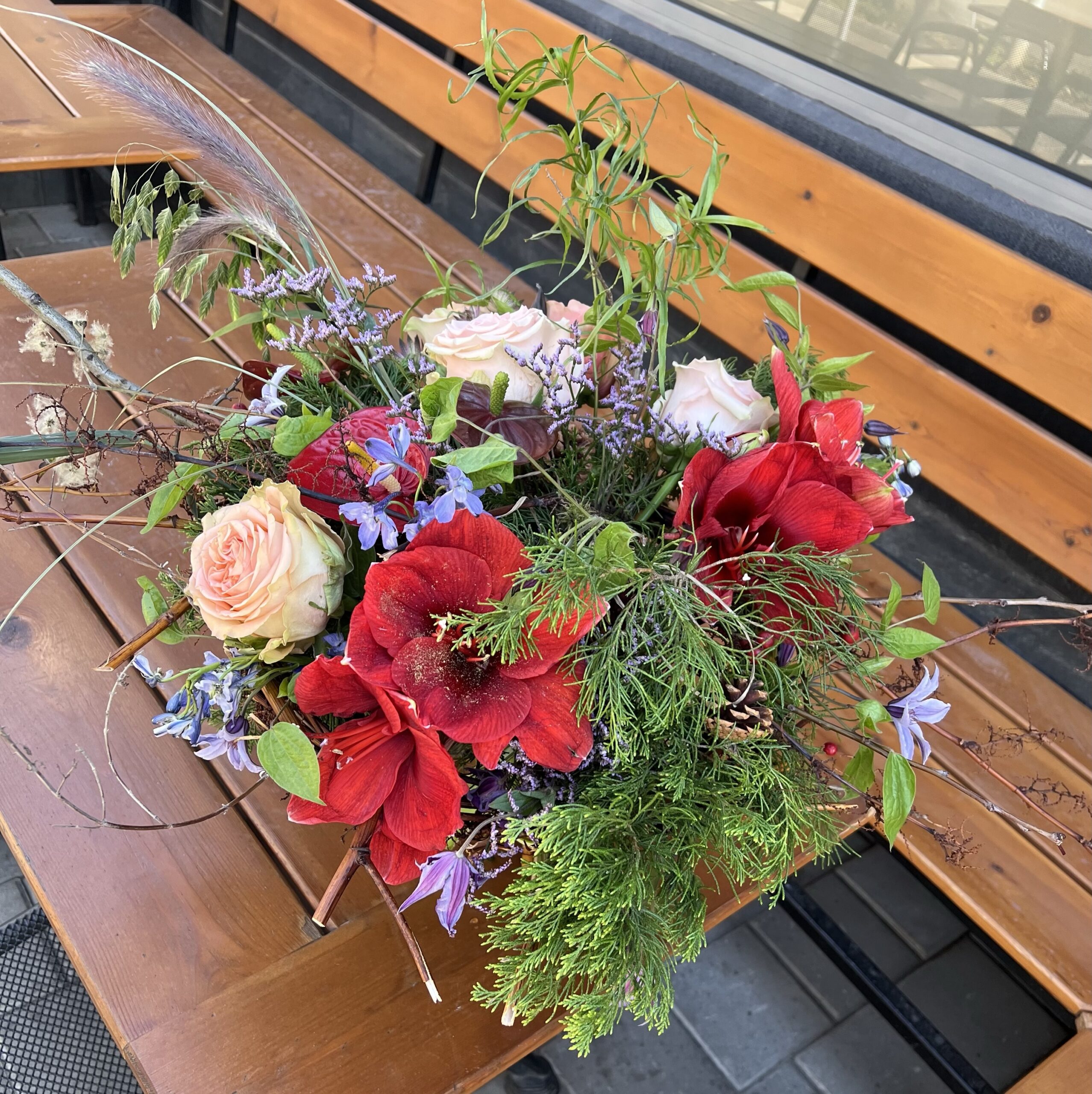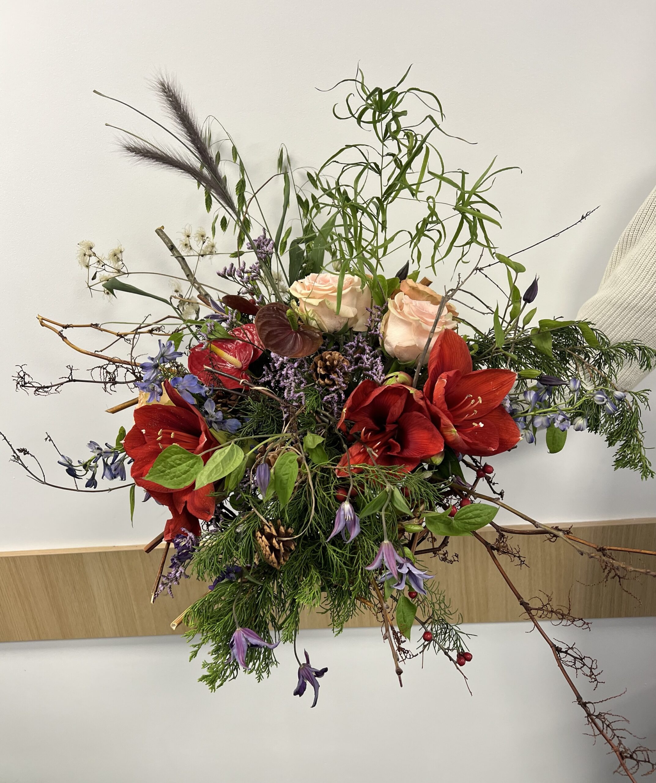 Амарилиси в наситено червено се преплитат с нежни рози в прасковено-розов нюанс, докато диви клонки, борови шишарки, лилави деликатни цветчета и естествени зелени текстури създават усещане за дълбочина, движение и живот.