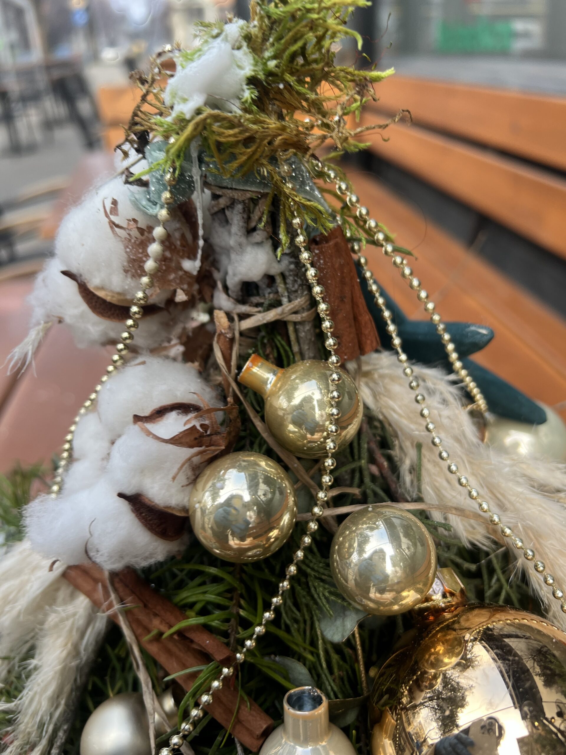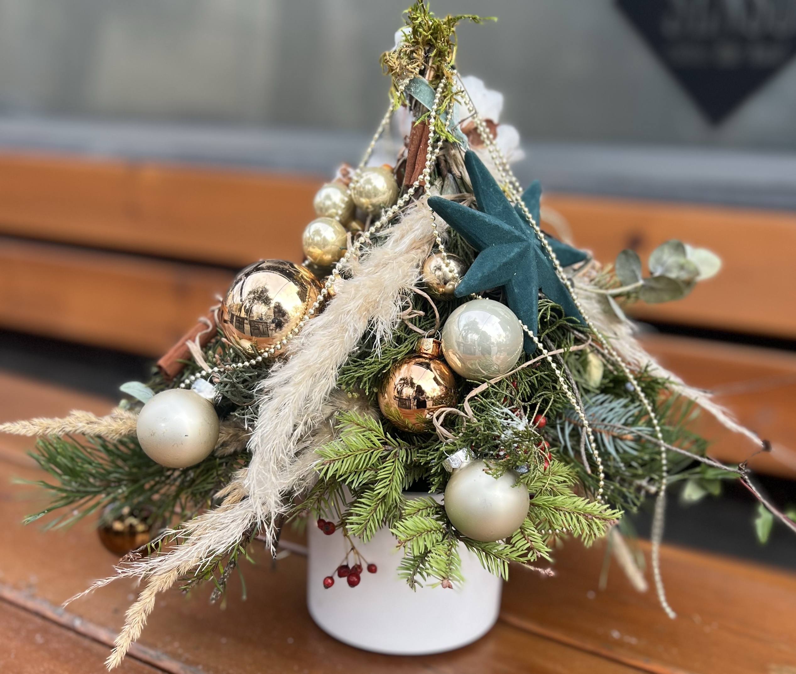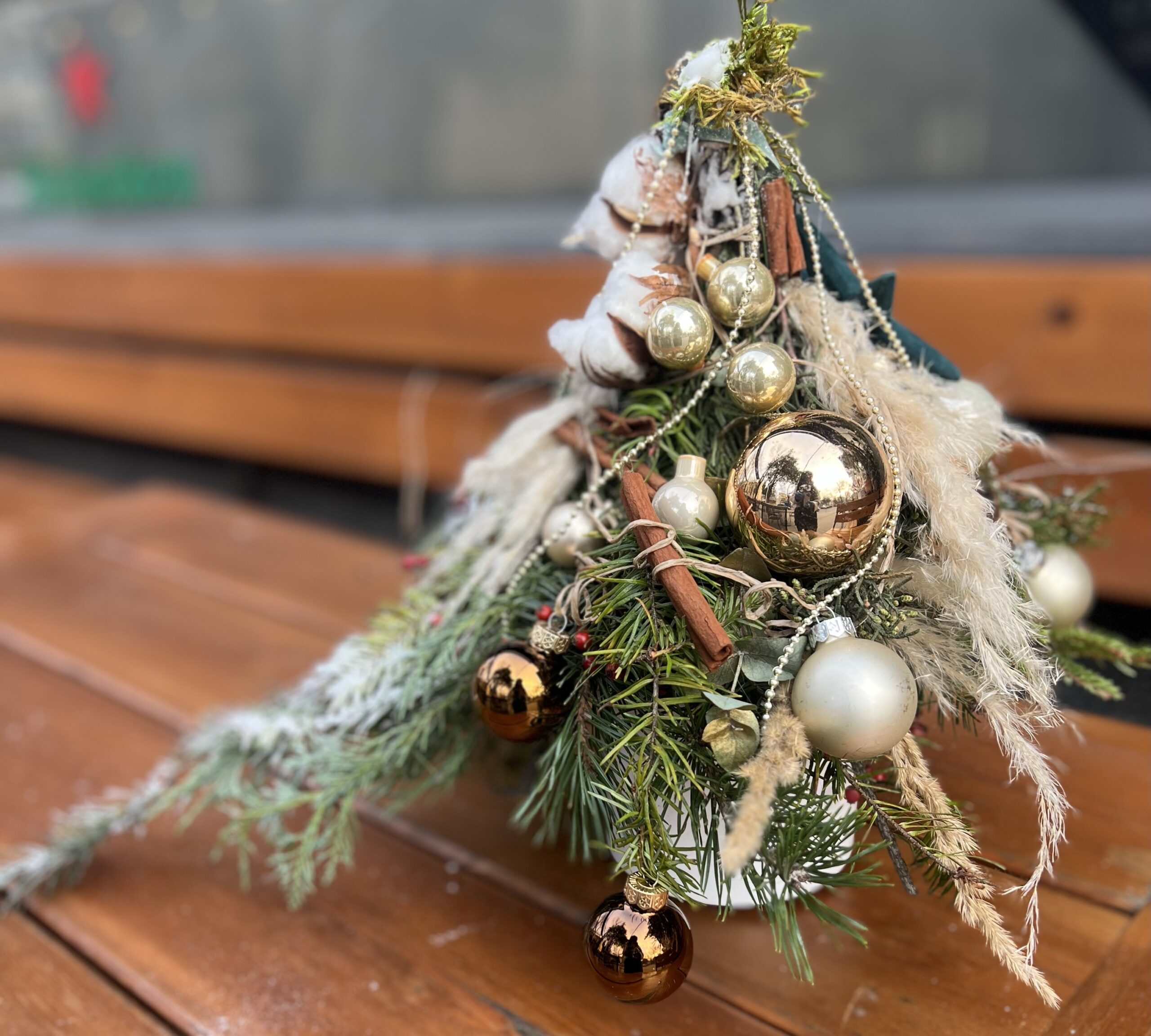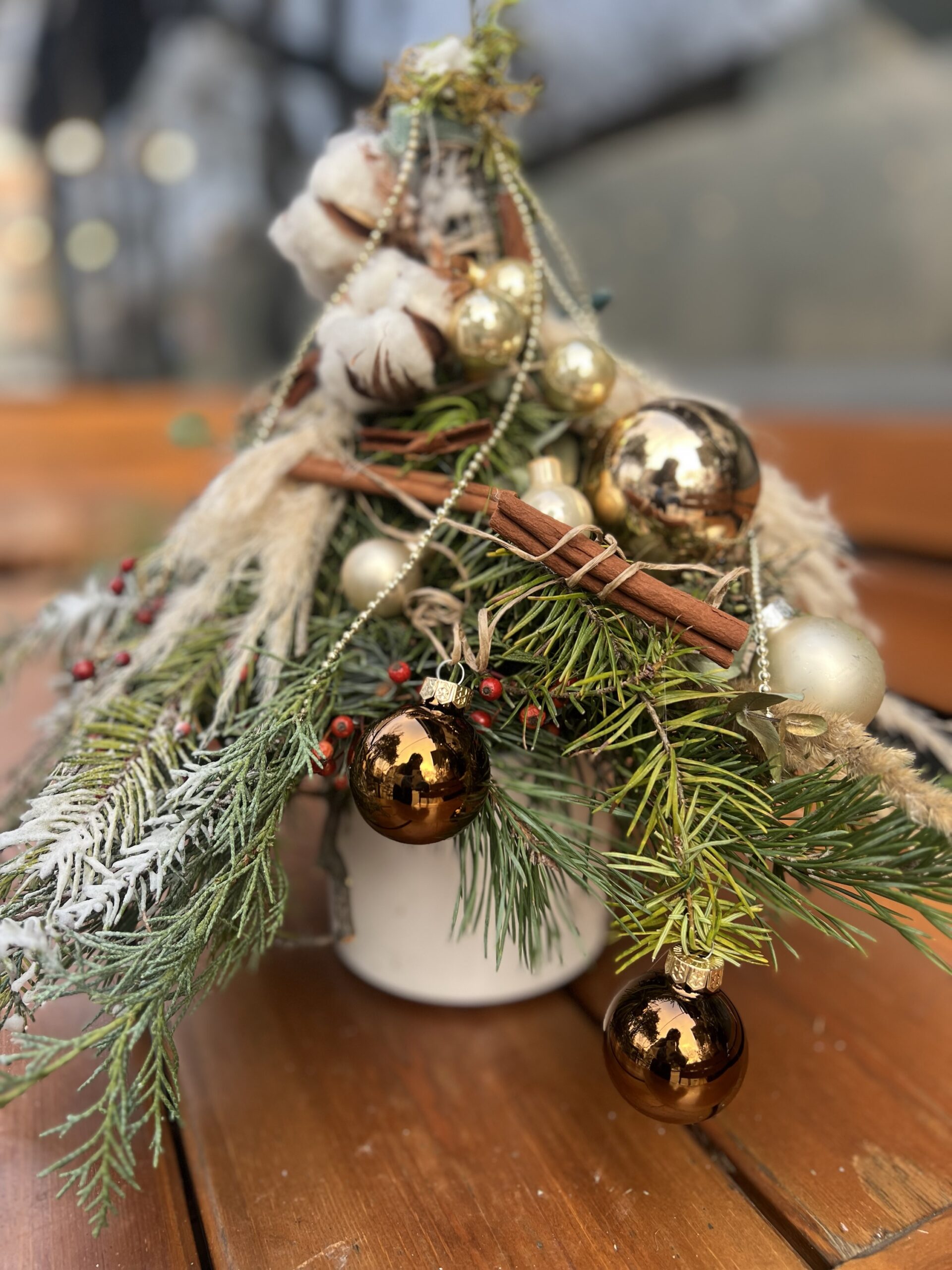Естествени елхови клонки, ароматна канела, златни коледни орнаменти, нежни, стъклени топки и нежни сухи треви се преплитат в елегантна, скандинавска визия с топъл празничен характер.