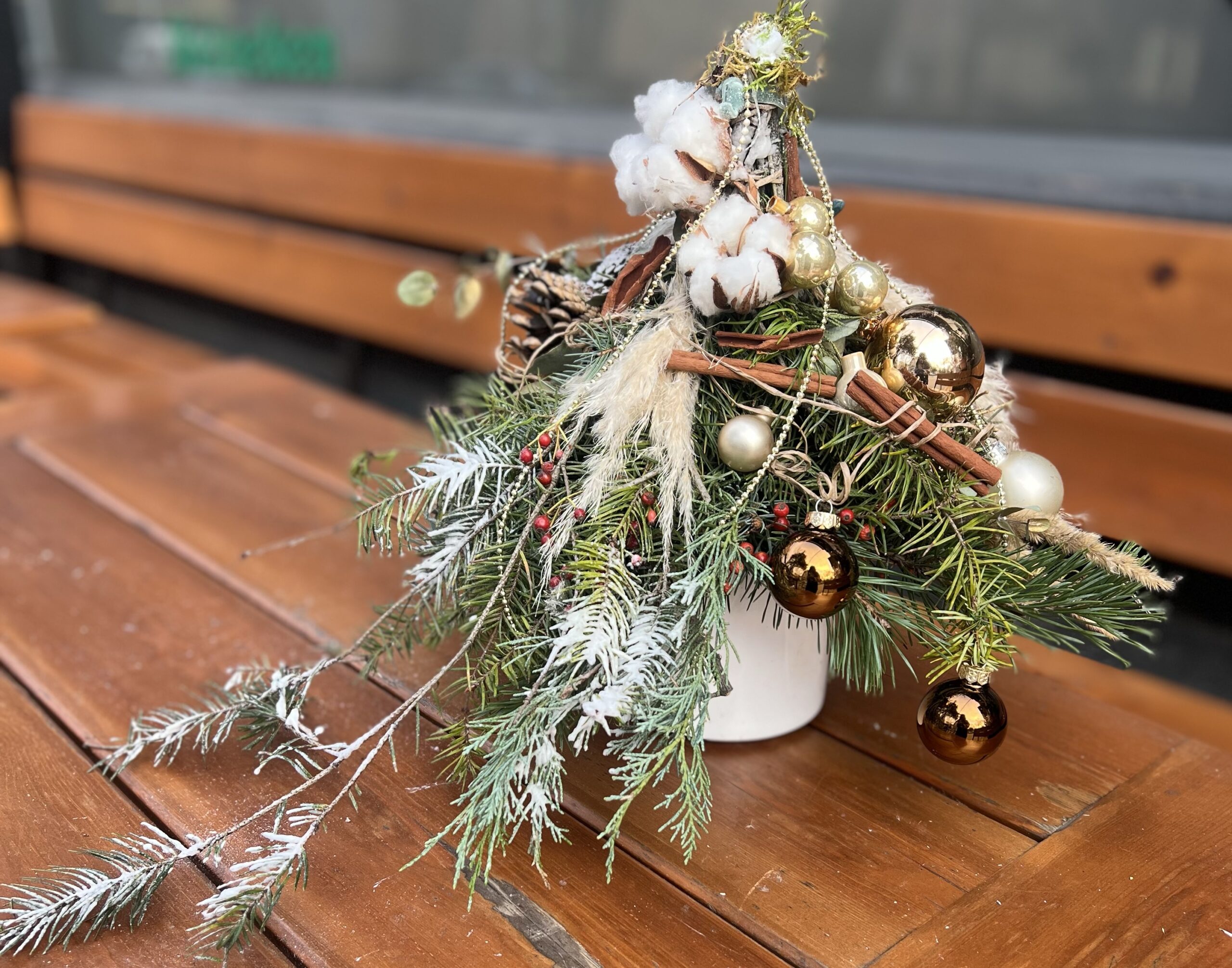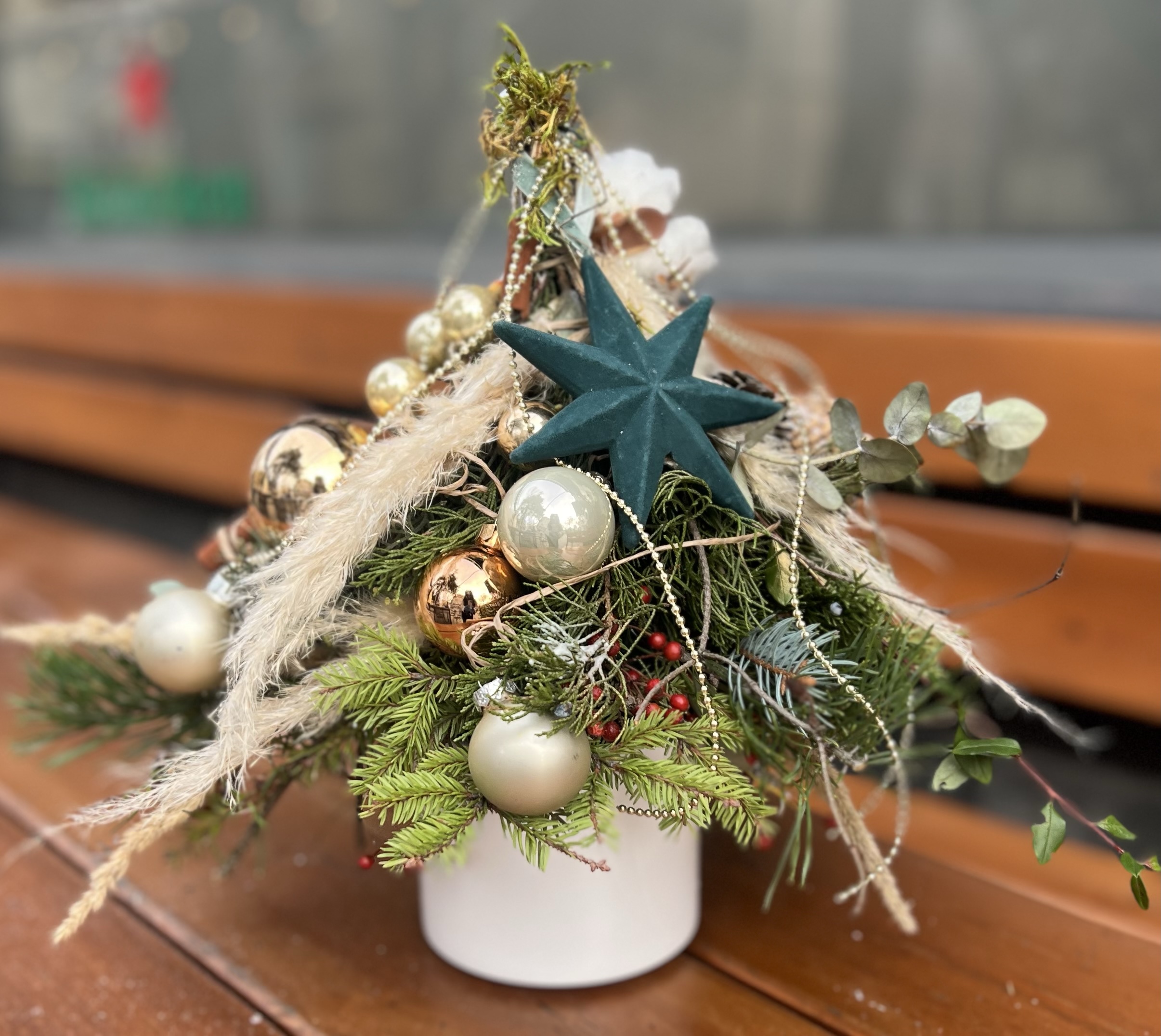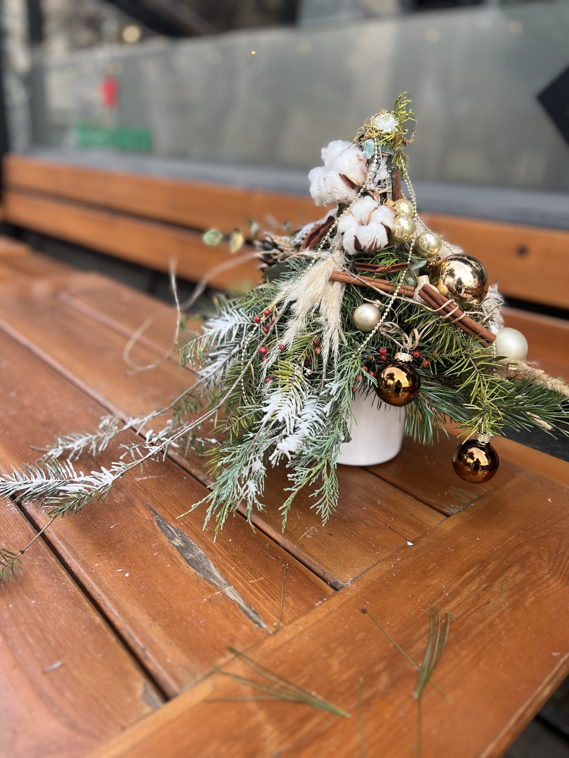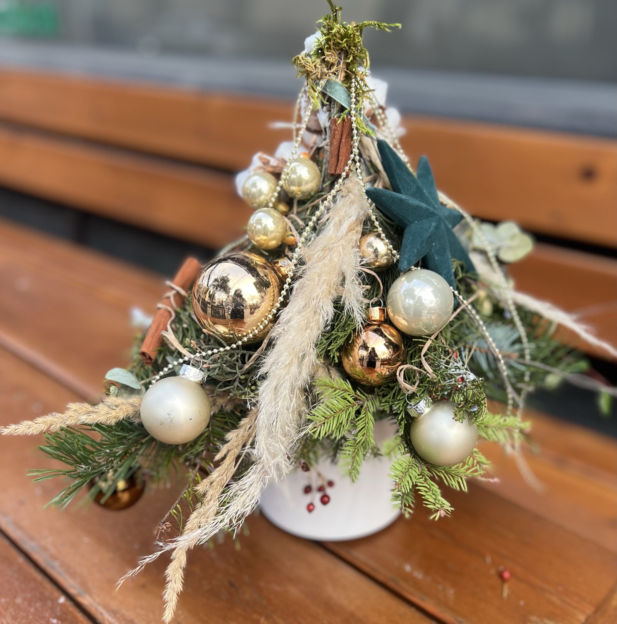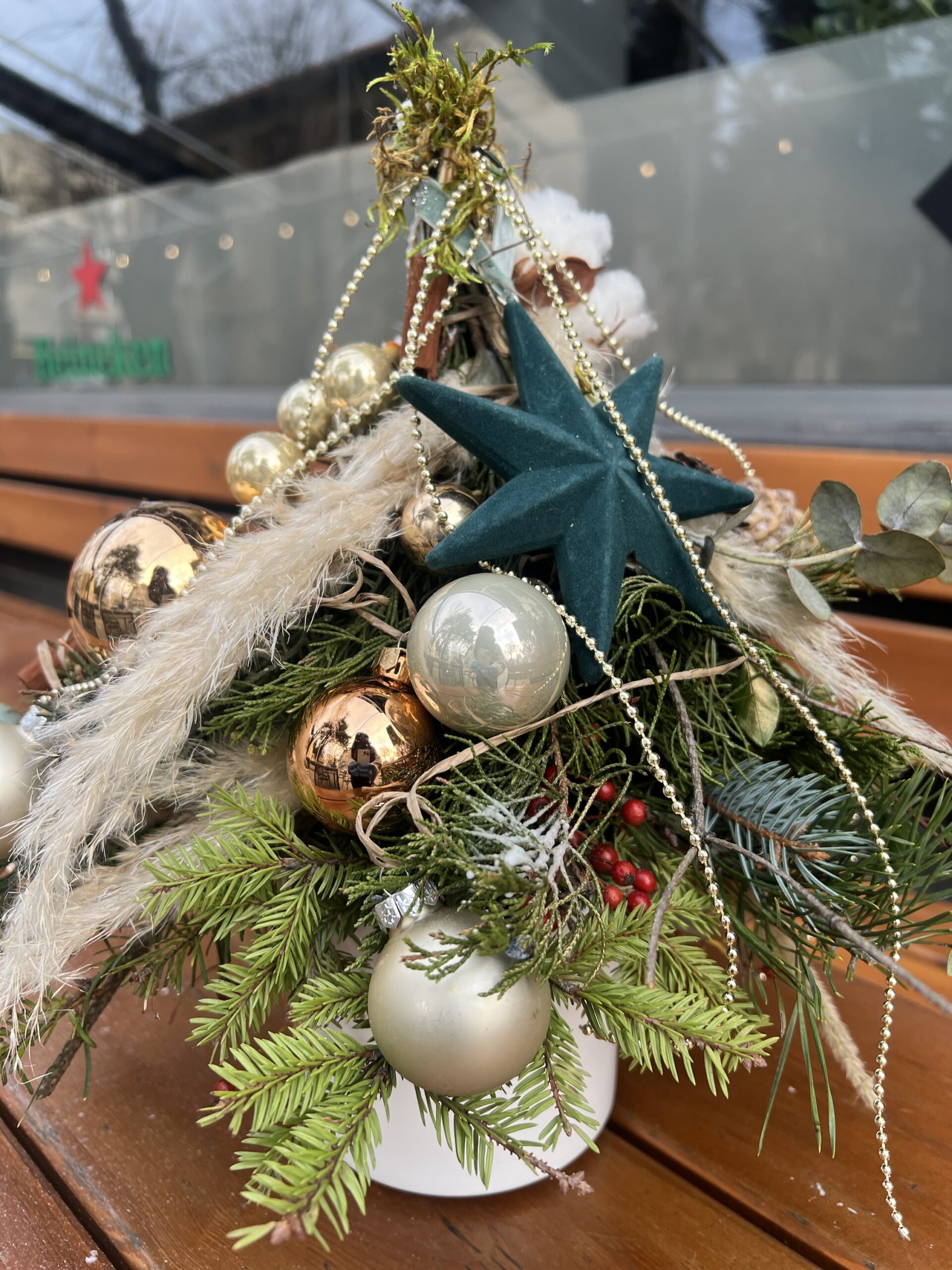 Естествени елхови клонки, ароматна канела, златни коледни орнаменти, нежни, стъклени топки и нежни сухи треви се преплитат в елегантна, скандинавска визия с топъл празничен характер.