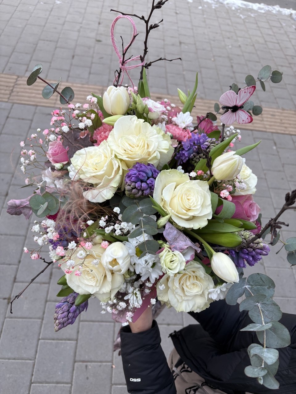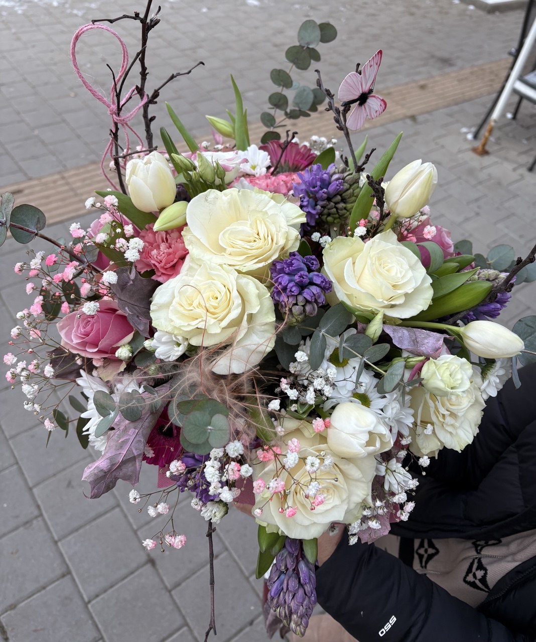 Кремави рози, ефирни лалета и ароматни зюмбюли се преплитат с фина зеленина и деликатни детайли, създавайки композиция, която носи спокойствие и радост.