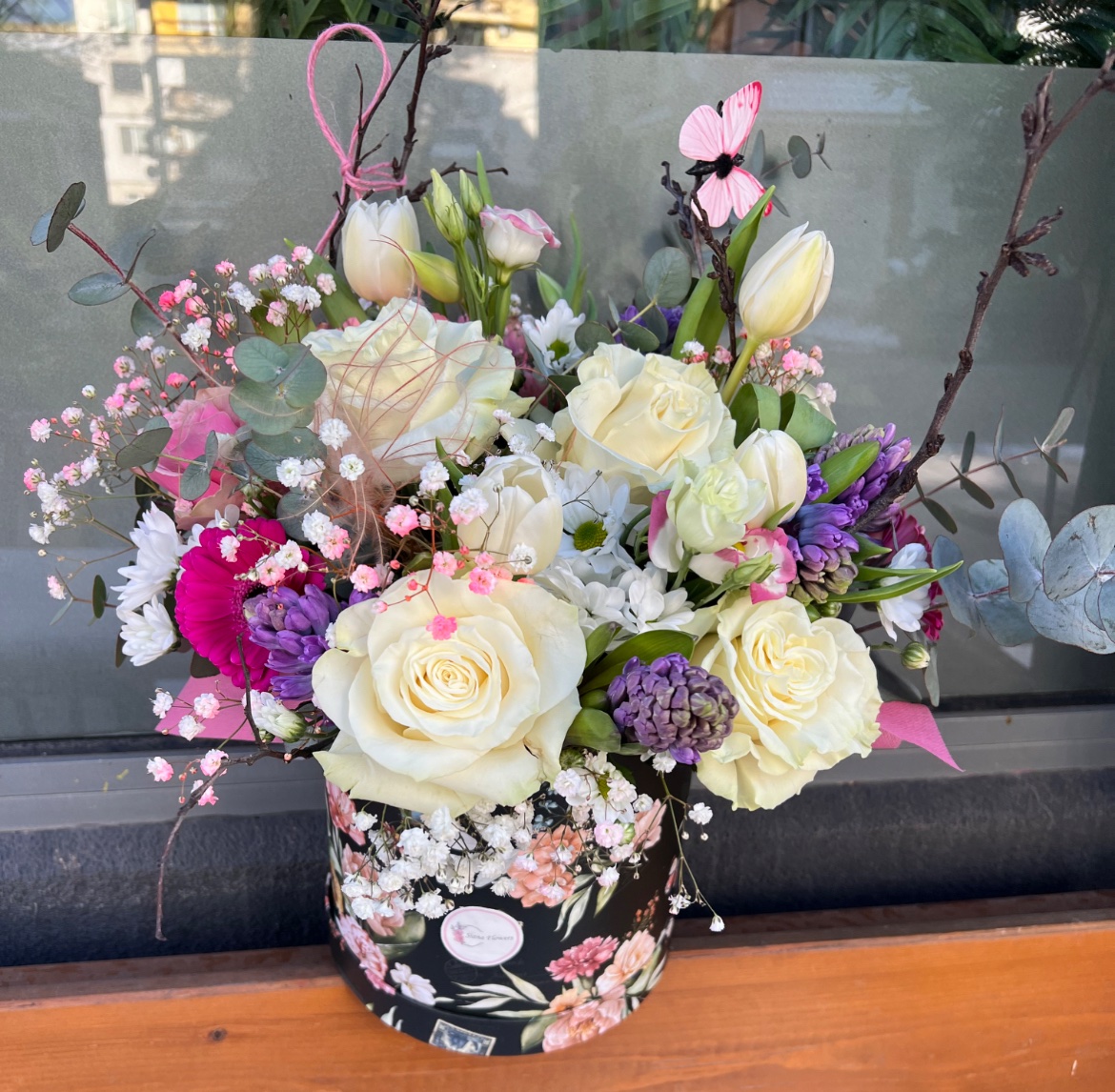 Всяко цвете е подбрано с внимание, а аранжировката разказва история за красота без излишна показност – естествена, балансирана и истинска. Кутията е създадена да бъде подарък сам по себе си – готова да заеме мястото си и да радва дълго.