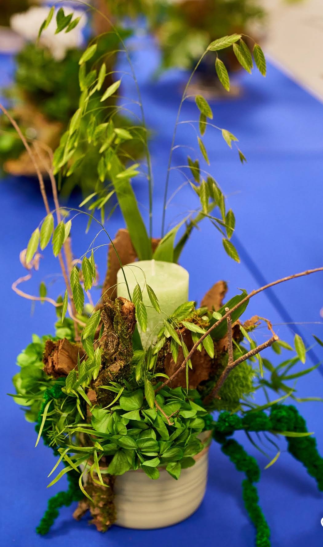 Материали: натурална зеленина, кори от дърво, мъх, декоративни стебла, свещ